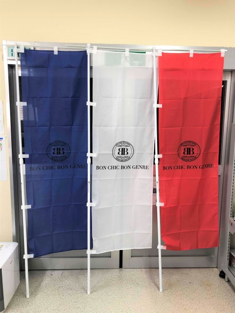 宇都宮市・BCBGJAPAN様より、3色のぼり製作を受注しました。 再度のご注文、誠にありがとうございます。 同社様はフランス直輸入・洋菓子店を営まれており、今回製作のぼりもブルー/ホワイト/レッド、3本組にて1セット・フランス国旗を表した製品です。 風になびくのぼりも工夫次第では大きな広告塔となります。「全体を纏めた色でイメージを思い浮かべる」は、最大限の効果発揮ではないでしょうか